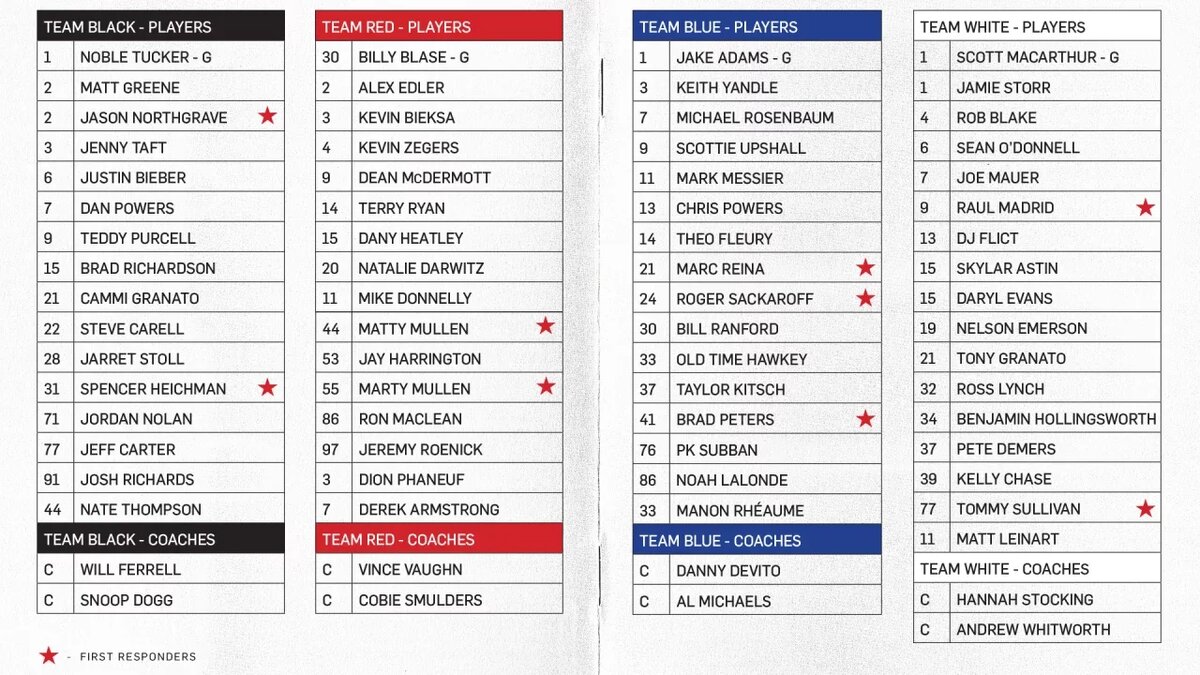 Событие пройдет 23 февраля в Лос-Анджелесе. Вырученные средства будут направлены на помощь пострадавшим от пожаров в Лос-Анджелесе. В результате лесных пожаров, перекинувшихся на город в середине января, было повреждено более 10 тысяч строений, около 180 000 человек были вынуждены эвакуироваться. Четыре команды проведут мини-турнир по олимпийской системе. В каждый из коллективов входят знаменитости, бывшие игроки НХЛ, а также члены пожарного и полицейского департаментов Лос-Анджелеса. В числе участников также присутствуют кинозвезды Дэнни Де Вито, Уилл Феррелл и Стив Карелл, музыканты Джордан Дэвис и Лорен Спенсер-Смит, члены Зала хоккейной славы Марк Мессье и Джереми Реник. Изображение: nhl.com/kings