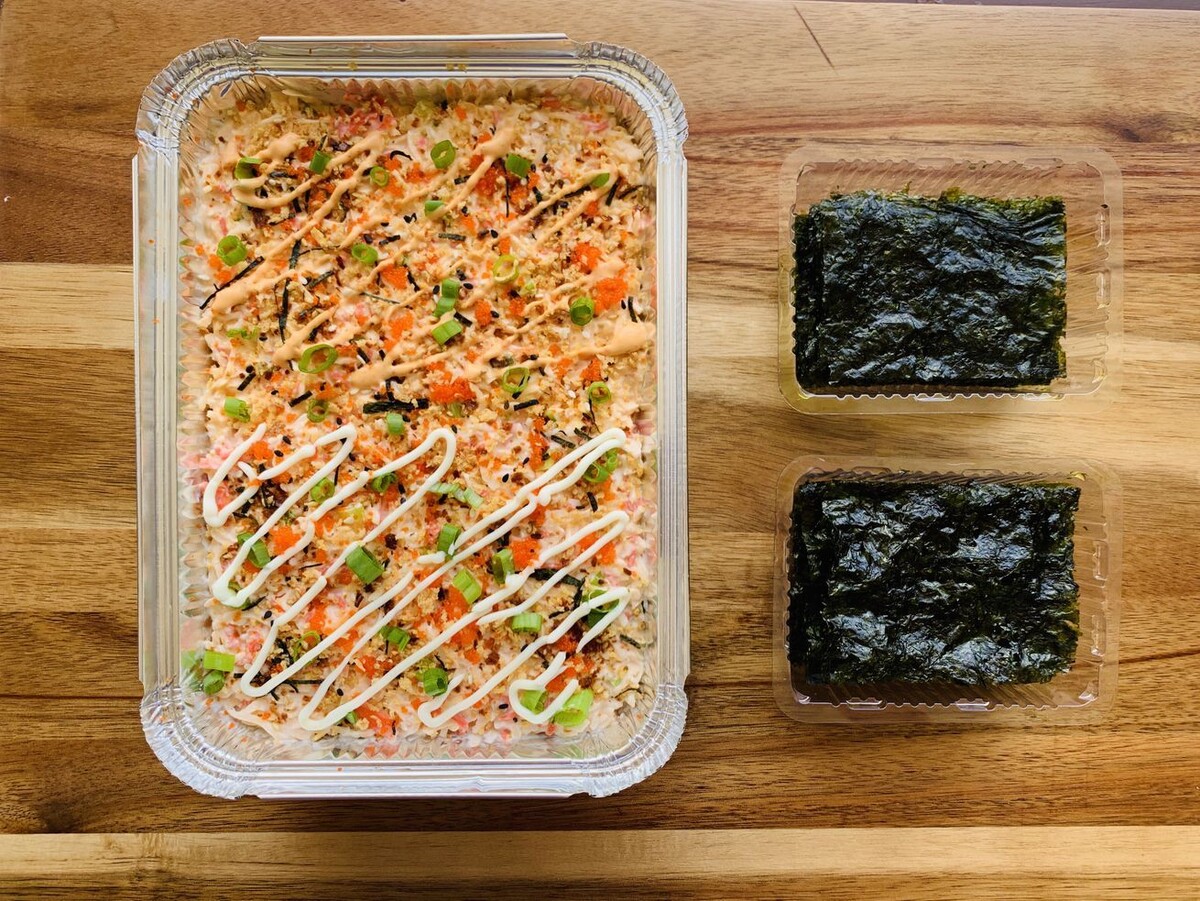 Пока рис остывает, приготовьте заправку: смешайте уксус для суши, сахар и соль. Полейте этой смесью горячий рис и аккуратно перемешайте деревянной лопаткой. 2. Приготовление начинки Нарежем крабовые палочки на маленькие кусочки (если есть блендер, с помощью него можете измельчить палочки). К полученной смеси добавляем сливочный сыр и икру с копченым лососем. Тщательно перемешиваем. Отдельно натрем на