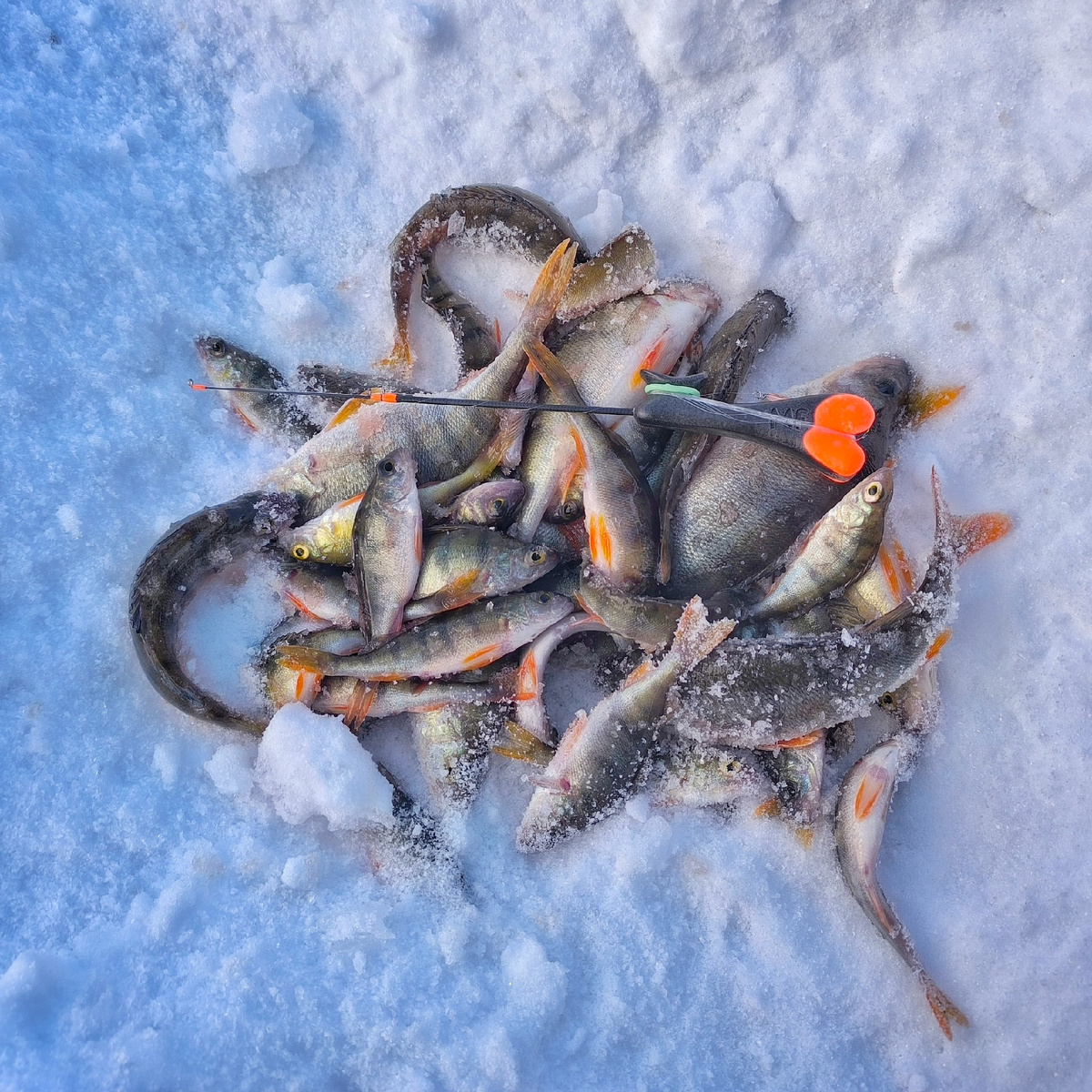 Рано- рано утречком, быстро разобравшись с домашними делами, с разбега прыгаю в стоящие наготове в прихожей сапоги, хватаю собраный с вечера ящик и топаю на пруд продолжать изучать водоём и искать окуня поприличней. Снова новый участок. Плотненько так его разбуриваю. Смотрю камерой под лёд. В некоторых лунках подо прямо льдом - огромные тучи малька... Интересненько. Но окуней пока не видать. Сажусь на первую лунку и начинаю стандартную процедуру "раскачки". Сбросы ото льда, широкие махи.. И всё в таком духе. Камеру пока убрал, чтоб не отвлекала. Первыми на блесну подтянулись, конечно же, "спортики". Один, второй, еще один.. Уверенная такая потяжка - и вполне приличный по меркам городского пруда окунец отправляется в ящик. Затем опять серия спортиков.. Опять ничошный... Так и ловил. В некоторых лунках было пусто, а в некоторых - окунь жрал малька. Ну и мою блесну. Полосатые были набиты мальком под завязку, и у многих мальки торчали из пасти. И всё бы хорошо.. Но ловить в режиме " лифта"