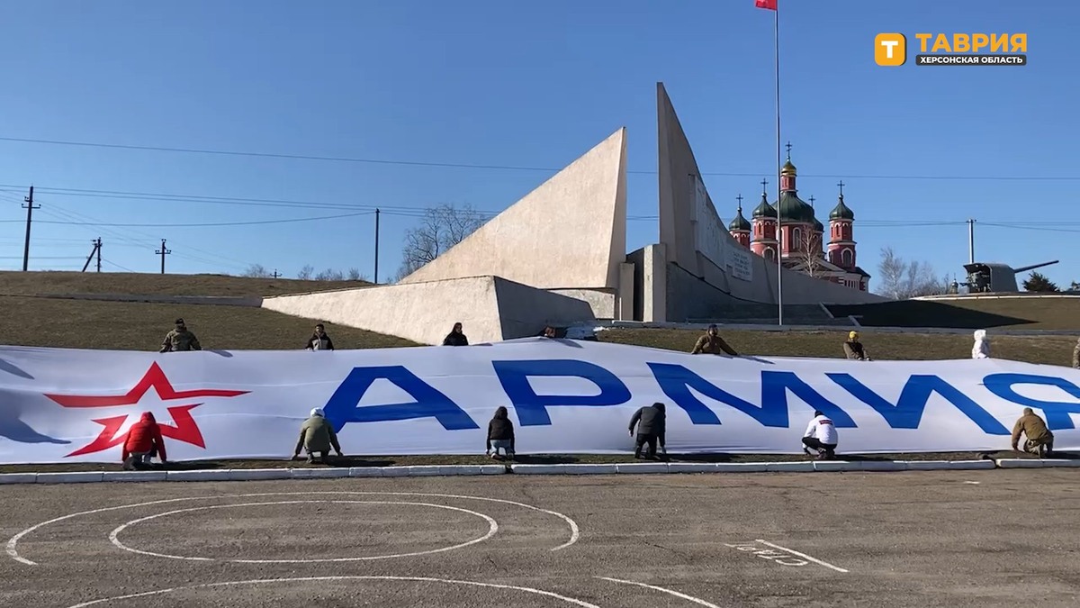 Активисты и военные развернули 50-метровый флаг армии РФ в Херсонской области