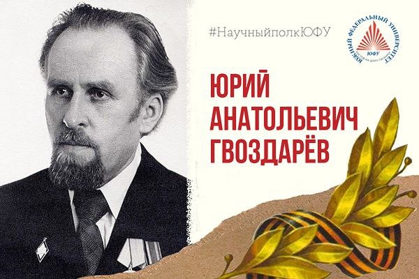 Ученые ЮФУ (на момент Великой отечественной войны – Ростовский государственный университет) в годы внесли огромный вклад в приближение Победы. Юрий Анатольевич Гвоздарёв родился 9 февраля 1925 года во Владивостоке. Когда началась Великая Отечественная война, ему было 16 лет. В 1943 году, как только ему исполнилось 18 лет, Юрий Гвоздарёв ушел на фронт — стал радистом, воевал рядовым в составе войск 3-го Украинского фронта и был отмечен четырьмя боевыми медалями, в том числе медалью «За Отвагу» и «Орденом Отечественной войны I степени». Когда в конце марта 1944 года освобождали город Николаев, Гвоздарёв получил тяжелое ранение в голову. Операцию провели успешно, вставили металлическую пластину, но, конечно, после такого ранения воевать он уже не мог. Юрия Анатольевича комиссовали, и он переехал в Ростов-на-Дону. Постепенно восстанавливая своё здоровье, он работал фотографом. В 1947 году поступил в Ростовский государственный университет на заочное отделение. По окончании обучения молодой