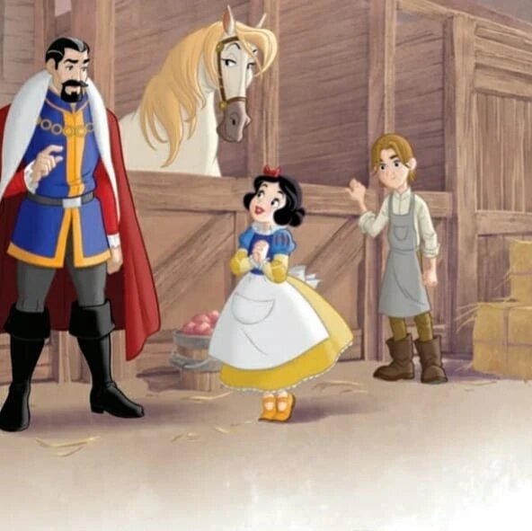 Есть такая серия, как "Disney Before the Story" - рассказывают тут приключения Принцесс до их основным мультипликационных историй. Вот в такой вот книжице мы можем наконец воочию увидеть родителей Белоснежки. Хорошо, отца, от которого она взяла цвет волос и глаз. Маму там не встретить, но её можно увидеть в официальных сказках и наклейках - везде она вышивает, но вот сама она выглядит по-разному.