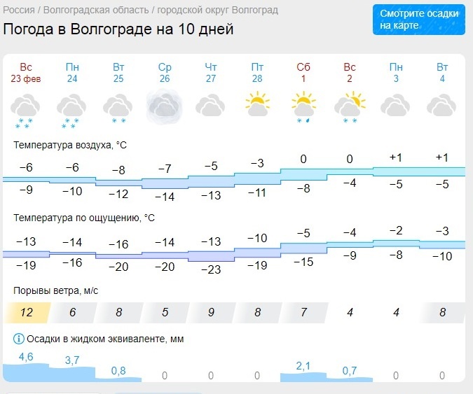 Итак, синоптики уже говорили, что 24 февраля ожидается самым ударным по количеству осадков. Сервис Gismeteo говорит, что за эти три дня, включая сегодняшний, на Волгоград обрушится 10 мм осадков. Тем временем в погодном центре «Фобос» намекают, что ждать возвращения тепла волгоградцам осталось недолго. Но перед этим переживем очень холодный рубеж. В первые дни новой недели жители южной части России действительно местами увидят снег. Судя по всему, к ним относится Волгоград и область. Про температуру и говорить нечего – холоднее обычного. По ощущениям дойдет до -23. И только лишь к четвергу-пятнице зима сжалится над нами, осадки сбавят свои обороты: - В четверг-пятницу вероятность осадков ожидается небольшой, так что воздух станет прогреваться: днём на Кавказе, в низовьях Волги и Дона до −3…+2. Синоптики уже говорили про трехдневное продолжение снегопада и о том, что юг страны теперь будет вынужден мерзнуть до конца февраля. Температурные показатели начнут возвращаться в норму в первые
