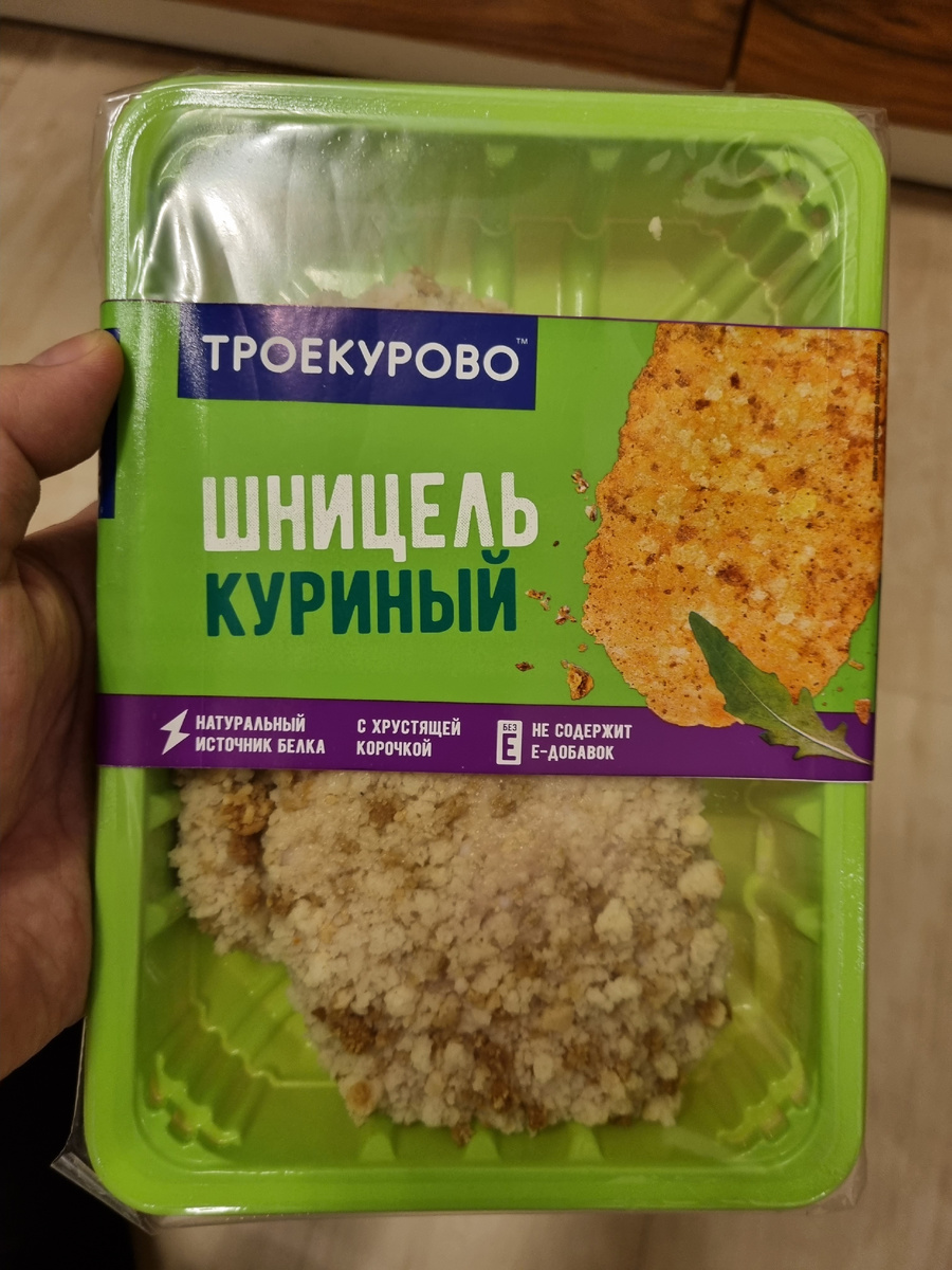 Сегодня у нас на обзоре куриный шницель. Вот такой: 159 рублей за 2 довольно крупных шницеля. По цене вполне нормально. Надписи на упаковке обещают хрустящую корочку, а также что продукт не содержит Е-добавок. По поводу последнего сразу обратимся к составу: В составе филе цыплят, кожа цвплят, вода, панировка (мука, дрожжи, топленое масло, арахмал, яичный белок, молоко сухое), волокно пшеничное, соль, лактоза, овощи (лук, чеснок), ароматизатор (курица, лук), дрожжевой экстракт, черный перец. Вроде все нормально, только не понятно зачем там ароматизатор курицы) Теперь ознакомимся с способом приготовления: Обжарить равномерно с каждоц стороны по паре минут, а потом жарить еще 10-12 минут не накрывая крышкой. Сказано -сделано: Выглядит неплохо, поэтому пробуем: Это съедобно, довольно неплохо на вкус, но сухо. Фарш этих шницелей очень сухой, очень похоже как будто бы он был сделан из куриных грудок. Может быть, это действительно так, кто знает. Другим недостатком является то что на упаковке