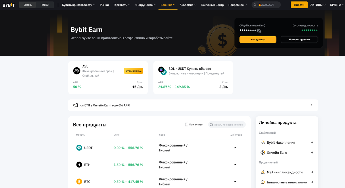 Функция Earn - Накопления предлагает инвестиционные продукты с гибким (накопительный счет) и фиксированным (срочный вклад) сроками, а также конкурентоспособными и гарантированными APR (процентом, ставкой вклада). Разместить на вклад можно BTC, ETH, USDT и другие популярные монеты.