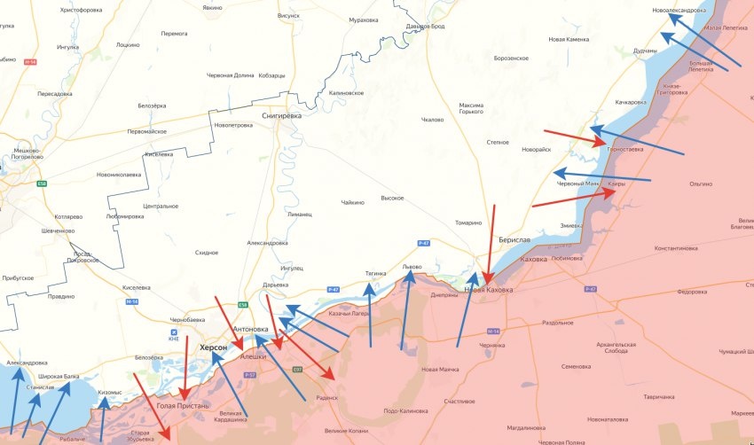 На правом берегу в результате обстрелов под огнём оказались Берислав, Змиевка, Белозерка, Шляховое, Станислав, Милово, Дудчаны, Тягинка, Казацкое, Высокое, Веровка, Матросовка, Антоновка, Приднепровское, Садовое, Красный Маяк, Велическое, Драдокаменка, Ольговка, Осокоровка, Софиевка, Токаревка и город Херсон.