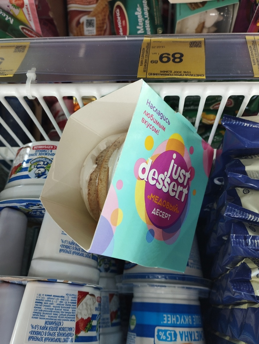 Перед нами "медовый десерт", который выполнен практически в классическом виде, просто выглядит иначе. Мягкий крем, не сухие бисквиты, в которых чувствуется вкус и аромат меда, а все вместе это создает довольно воздушный и не приторный десерт. Я думала, что он будет сухим, как многие магазинные пирожные, но нет! Крема предостаточно, в нижней части упаковки его даже с избытком, а при цене в 99 рублей и не найти недостатков.