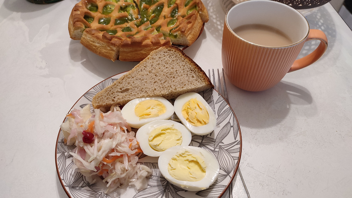 Всем приветик, мои дорогие 🤗🤗🤗 Честно, я уже не знаю что готовить 😬🤷♀️ Фантазии ни на что не хватает. Еще муж в отпуске. Хотя, муж, если надо, что нибудь да приготовит. Отправили детей в садик и в школу. Ближе к 9, начала думать, что мы будем есть? Что-то забыли по дороге домой купить хлеб. Муж пошёл в магазин. Взял хлеб, и пирог к чаю. Отварила яйца. Я тут хорошо начала есть квашеную капусту. Это же полезно. Надо будет ещё купить. После завтрака муж полежал, потом пошёл отдыхать. Ну и пусть. У него же отпуск. Поехали за сыном. И здесь я ломала голову, не зная, что приготовить на обед. И в магазин больно не хочется. Что ещё купить? Получается, что на этой неделе много потратились. Мы давно не ели драники. В холодильнике лежал салатный лист. Надо есть, а то испортится. Оформила всё красиво. Очень, очень вкусно😍 В морозилке лежала скумбрия. Столько времени хочется рыбу. Дети то понятно, есть не будут. Для них есть вареники. Вареники они любят. Скумбрию запекла в аэро