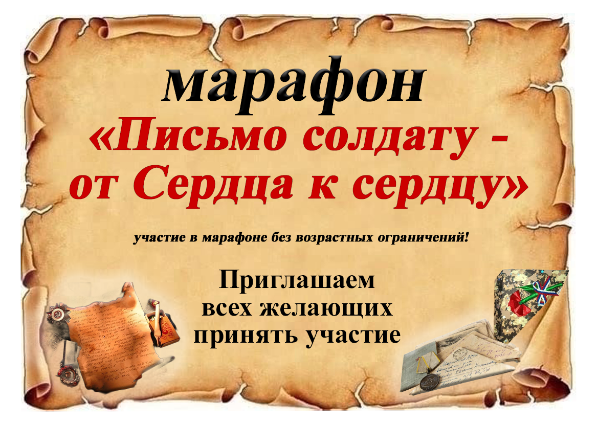 7. Номинации: Для участия в марафоне необходимо: В тексте письма укажите следующие данные: После публикации вашего материала на официальных ресурсах организаторы свяжутся с вами для подтверждения. Вам также потребуется самостоятельно разместить ссылку на свое поздравление в своем профиле в социальных сетях, отметив официальный аккаунт марафона и используя хештег #ПисьмоСолдатуОтСердцаКСердцу.