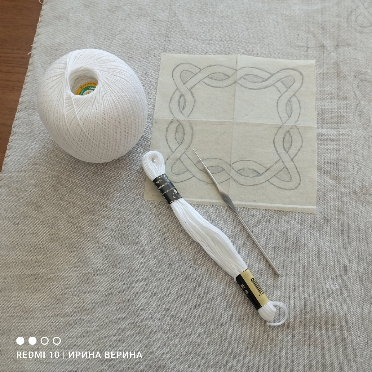 Так что же это будет? А это будет мини-скатерть, состоящая из 9 мотивов из льняной ткани. К каждому мотиву пришивается вязанная крючком кайма и затем между собой соединяются. Поскольку край льна очень сыпучий, набор петель делать сложно. Поэтому кайма вяжется отдельно и пришивается на машинке зигзагом.