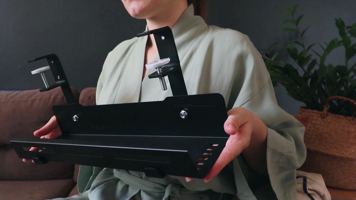 Вешаю полку на край стола и закручиваю специальный винт с пластиковой насадкой. С помощью такого крепежа можно надежно зафиксировать полку на столе любой толщины.