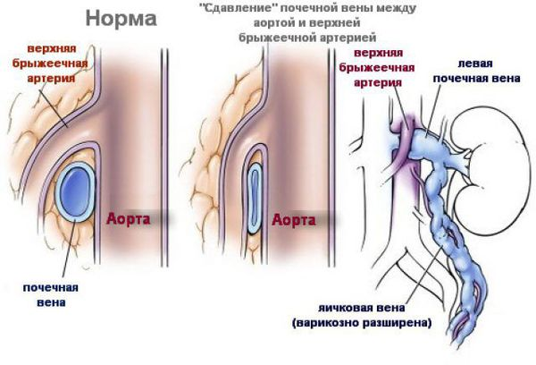 Стоит добавить, что в почечную вену впадает яичниковая вена, отток по которой тоже пострадает. Понятно, что клинические проявления будут зависеть от угла выхода верхней брыжеечной артерии, расстояния от бифуркации до вены и качества стенок вены. Тем не менее, вероятность такого исходя после гистерэктомии должна подрасти.