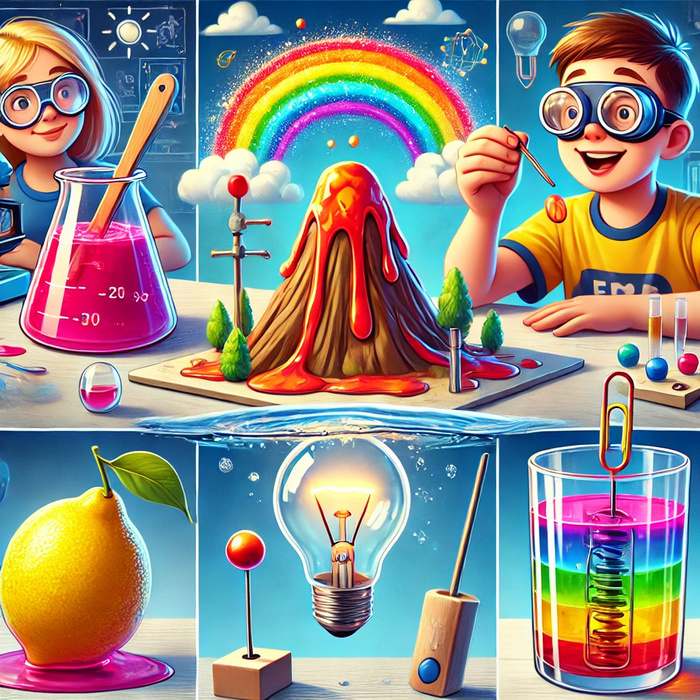 1. Лавовая лампа. Что понадобится: Прозрачная пластиковая бутылка или банка. Растительное масло. Вода. Пищевой краситель. Таблетка шипучего аспирина. Как провести: Наполните бутылку на три четверти растительным маслом. Добавьте немного воды, чтобы она заполнила оставшееся пространство. Капните 5–10 капель пищевого красителя. Разломите шипучую таблетку и бросьте кусочки в бутылку. Результат: Пузырьки окрашенной воды будут подниматься и опускаться через масло, создавая эффект лавовой лампы. Это происходит из-за разницы в плотности воды и масла и выделяющегося углекислого газа. 2. Вулкан из соды и уксуса. Что понадобится: Пищевая сода. Уксус. Жидкое мыло. Пищевой краситель (опционально) Пластиковая бутылка. Как провести: Установите бутылку в центре подноса или контейнера. Насыпьте в бутылку 2–3 столовые ложки соды. Добавьте несколько капель пищевого красителя и немного жидкого мыла. Быстро влейте 50 мл уксуса. Результат: Из бутылки начнет выливаться пенистая "лава". Реакция происходит из-