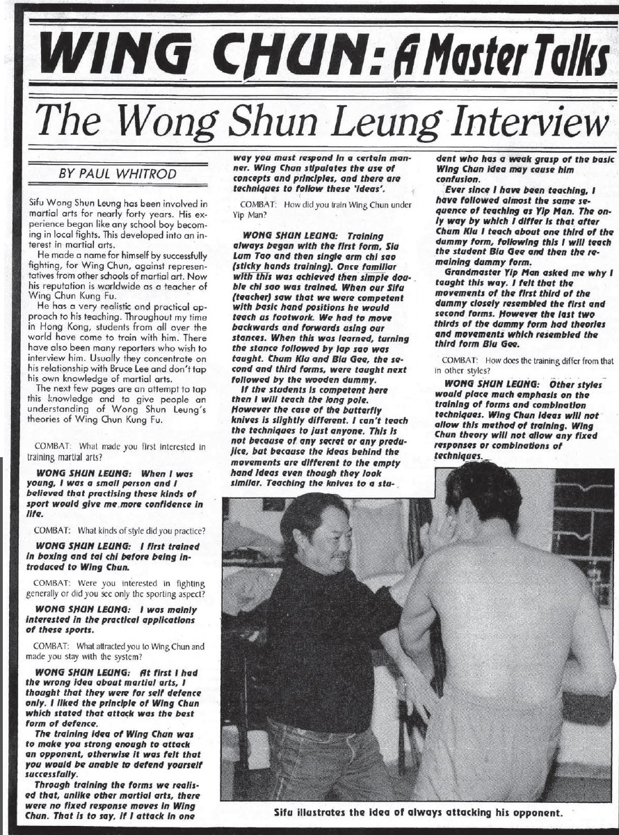 Распер Патель: Сифу Вонг Шун Леунг занимается боевыми искусствами уже почти 40 лет. Его опыт начался, как у любого школьника, с участия в местных боях. Это переросло в интерес к боевым искусствам. Он сделал себе имя, успешно сражаясь за Вин Чун с представителями других школ боевых искусств. Теперь его репутация во всем мире как учителя Вин Чун Кунг Фу. У него очень реалистичный и практичный подход к преподаванию. За все время моего пребывания в Гонконге к нему приезжали тренироваться ученики со всего мира. Было также много репортеров, которые хотели взять у него интервью. Обычно они концентрируются на его отношениях с Брюсом Ли и не используют его собственные знания боевых искусств. Следующие несколько страниц — это попытка использовать эти знания и дать людям понимание теорий Вин Чун Кунг Фу Вонг Шун Леунга.
