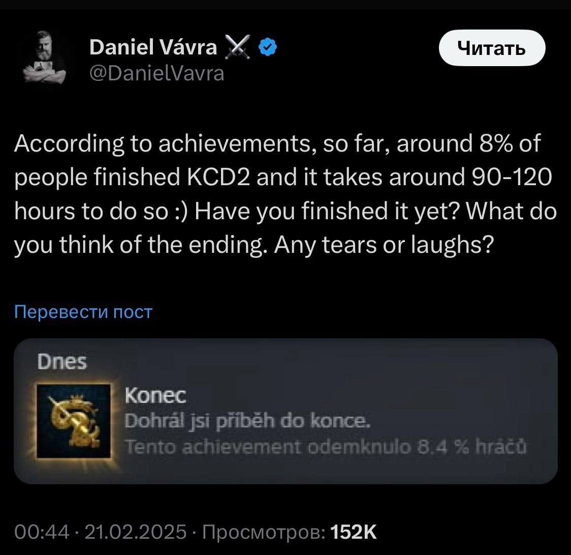 Даниэль Вавра сообщил, что лишь 8,4% получили соответствующее достижение, а прохождение занимает 90–120 часов.
