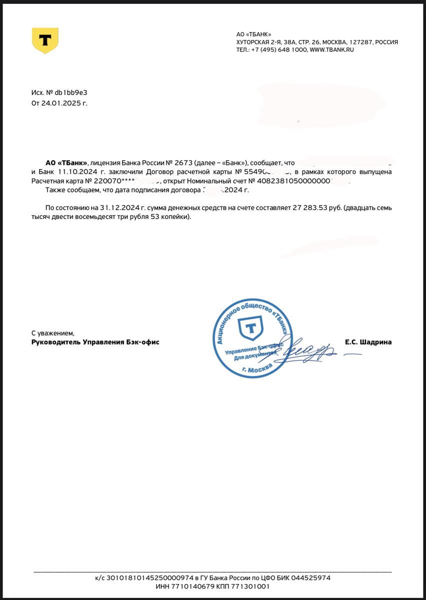 А теперь обратите внимание в справке ТБанка указано, что "заключен договор расчетной карты, в рамках которого выпущена расчетная карта, открыт номинальный счет"... не указано, что карта выпущена к номинальному счету, не указано, что номинальный счет открыт к карте... Это означает, что открыты они независимо друг от друга.