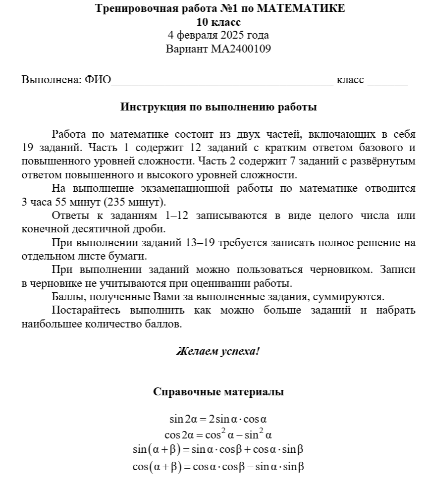 Опубликована тренировочная работа №1 статград по математике 10-11 класс в формате ЕГЭ 2025 года тренировочные варианты МА2400101-МА2400110 с ответами и решением для подготовки к государственному экзамену ФИПИ дата проведения пробника 4 февраля 2025.