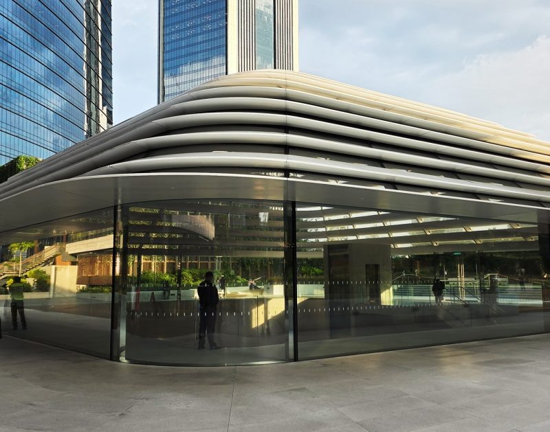 Еще около шести зданий в комплексе имеют высоту более 200 метров, деловой район построен по образу и подобию многих городских центров современных мегаполисов. Архитектура отдельных башен невзрачная, они не притягивают взгляды, похожи на раскиданные по сетке городских улиц кубики Lego. Отсутствие ярких акцентов, преобладание темных цветов, перемежающихся с зеркальными поверхностями. И вот в таком месте архитектурное бюро Foster+Partners начало проектировать здание магазина Apple. Каждый проект этого бюро для Apple уникален, не имеет аналогов и создается под конкретное место. Например, в бухте Сингапура они построили купол из стекла и металла. Простые формы перекликаются со зданиями, расположенными вокруг, выделяют здание от Apple, привлекают к нему внимание. Но роскошь тут не кричащая, вкуса архитекторам не занимать.
