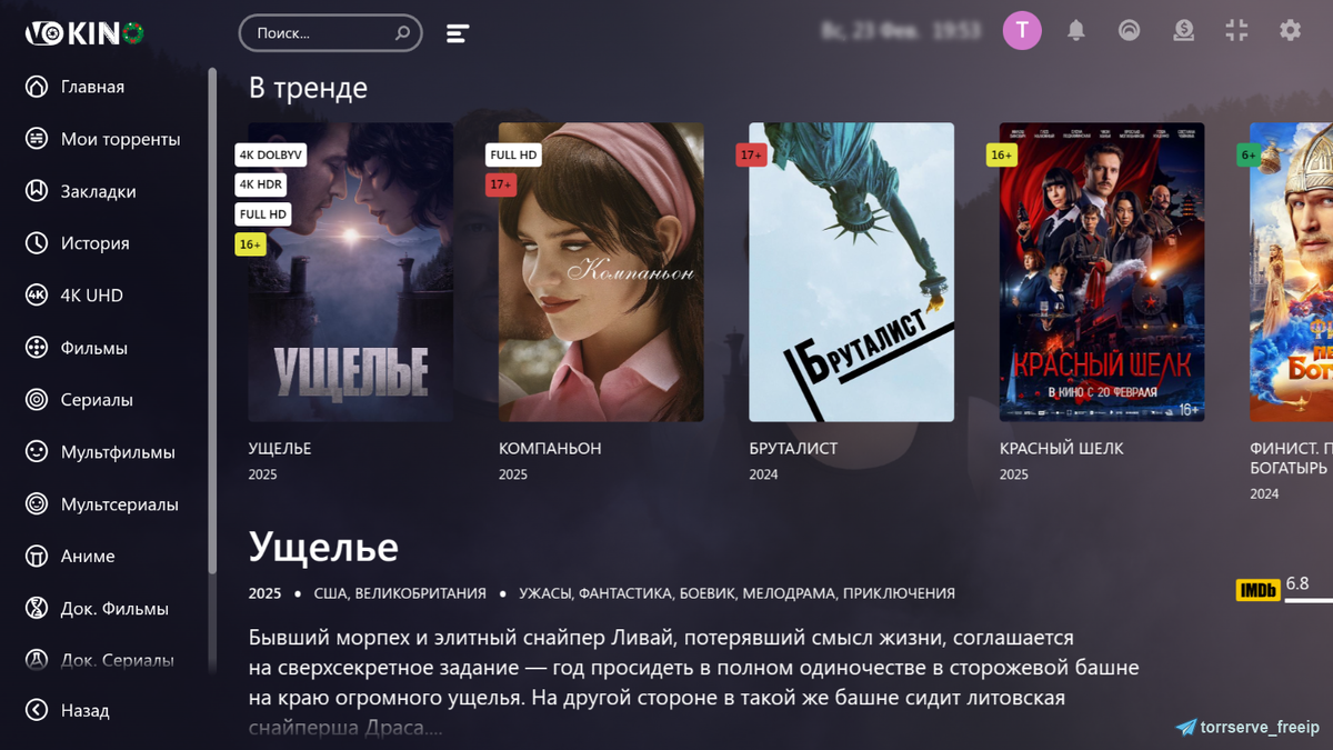 VoKino - приложение для поиска и просмотра фильмов и сериалов. Просмотр возможен с онлайн источников или через торренты. Есть раздел закладок, истории просмотров, а также различные сортировки по жанрам или актёрам. Официальный сайт приложения, там нужно будет зарегистрироваться. Онлайн просмотр платный, но нас интересует просмотр с торрентов и это совершенно бесплатно! Приложение доступное почти для всех устройств: Android, Tizen или Orsay (Samsung TV), WebOS (LG TV) и Windows. А так же через Media Station X в магазине приложений nnmtv.pw (прописать этот адрес в настройках плейлиста) Запускаем приложение и проходим авторизацию, прописываем e-mail и пароль, которые использовали при регистрации на сайте или добавляем код в личном кабинете на сайте. Нажимаем на шестеренку в правом верхнем углу и переходим в настройки приложения. Что бы смотреть торренты онлайн, нужно прописать адрес торрсервера в настройках сервера. Адрес бесплатного торрсервера ищем в TG здесь или прописываем свой. Вот и