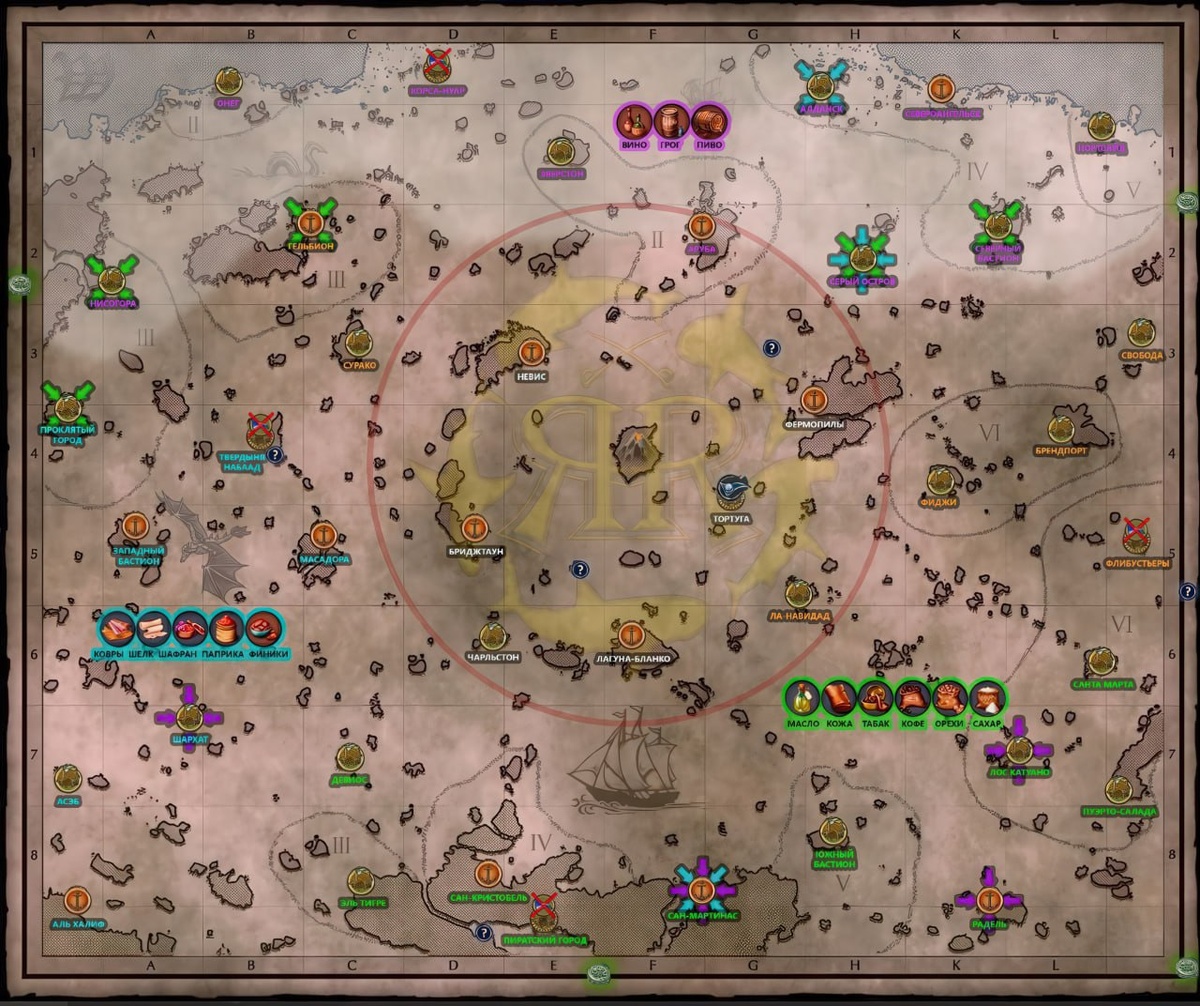 Ниже приведу несколько карт с различными отметками! Требования: Соответственно, возим товары по цветам в различные порты, смотрите ценность товара и его вес, но, как правило, самые ценные товары уже разбирают другие игроки. Для начала в World of Sea Battle рекомендуется заложить промышленную базу, чтобы быстрее набирать ресурсы для постройки серьёзных кораблей. Есть 6 типов мастерских, для которых нужны ресурсы. Их можно не только купить, но и возвести на островах добывающую постройку. Несколько советов, с чего можно начать: Желательно, чтобы поблизости были порты с нужными мастерскими. При этом нужно учитывать, что ресурсы будут скапливаться на личном острове, и их придётся отвозить на переработку. Каждый капитан может владеть тремя личными островами, доступ к которым открывается: Военные фракции: Торговая фракция: Пиратская фракция: Все фракции (кроме торговцев) находятся в состоянии войны друг с другом, в течение каждого сезона соперничают за влияние и территории. Я хочу сосредоточ