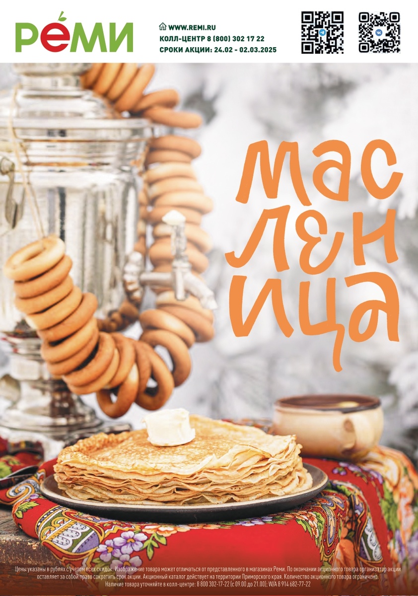 Масленица стучится в дверь! Мы приглашаем вас отпраздновать этот радостный и сытный праздник вместе с нами! В наших магазинах вы найдете все необходимое для приготовления самых вкусных и ароматных блинов по выгодным ценам: муку высшего сорта, свежее молоко от местных фермеров, отборные яйца, сливочное масло, домашнюю сметану, натуральный мед и множество других ингредиентов, которые сделают ваши блины незабываемыми! А для того, чтобы ваши блины получались идеально ровными и золотистыми, мы предлагаем широкий выбор подходящих атрибутов для кухни. Выберите свою идеальную сковородку в РЕМИ и станьте настоящим мастером блинов! Переходите на наш КАТАЛОГ Акция действует с 24 февраля по 2 марта
