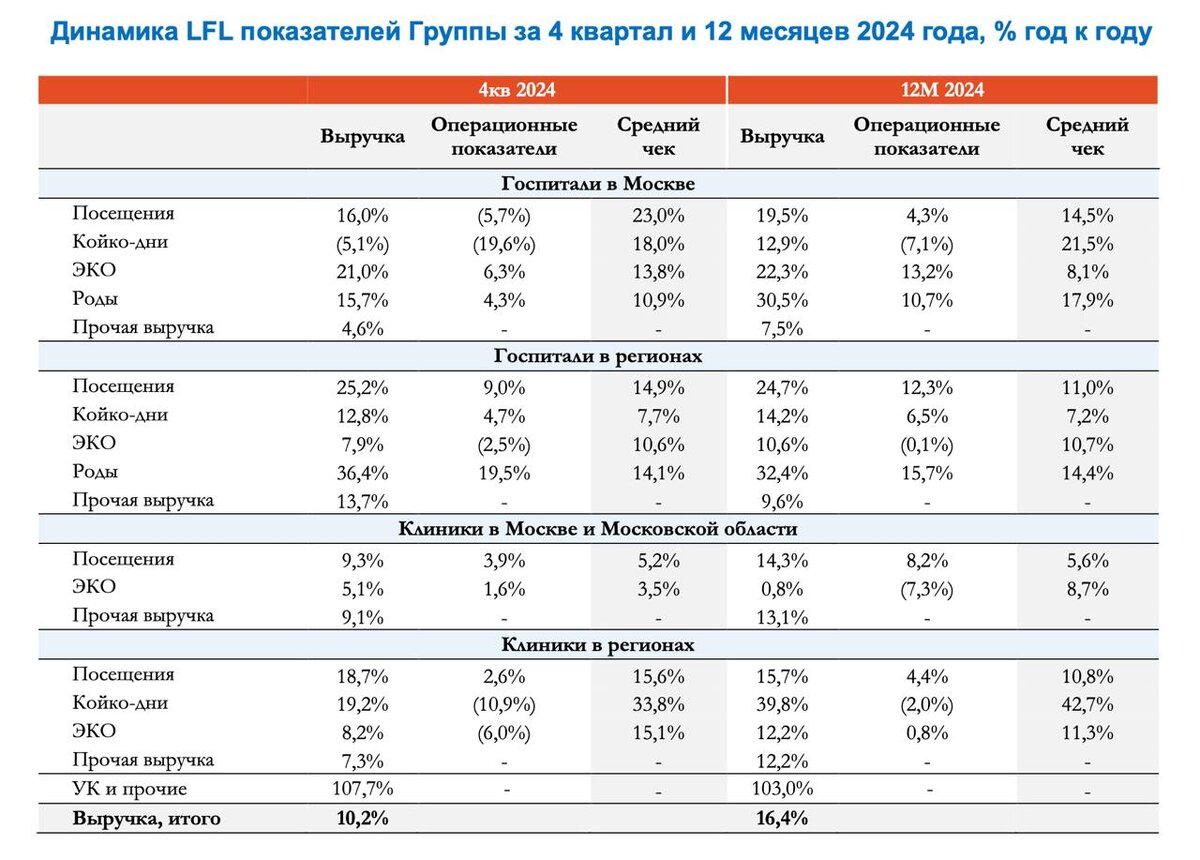 Пожалуй, лучшая идея в секторе здравоохранения! Этой фразой надо было бы завершить статью, но все не так очевидно, как может показаться со стороны. Сегодня я хочу разобрать свежий операционный отчет компании за весь 2024 год и ответить на вопрос: всем ли подходит данная инвестиционная идея? Итак, общая выручка Группы за отчетный период выросла на 19,9% до 33,1 млрд рублей. Показатели компании стоит оценивать по аналогии с ритейлом, поэтому захватим еще и сопоставимые продажи (LFL), которые прибавили 16,4%. Это важно, ведь Группа проводит активную географическую экспансию и открывает новые клиники. Из последнего - клиники в Хабаровске и Красногорске. Учет результатов новых клиник может немного изменить общую картину. В нашем случае разница всего в 3% по выручке. Возвращаясь к «лайкам», тем самым сопоставимым продажам (Like-for-Like), отмечу, что средний чек по всем сегментам прибавил примерно 15%. Как я и говорил, методы оценки ритейла применимы и к «Мать и Дитя». Так, компания перенос