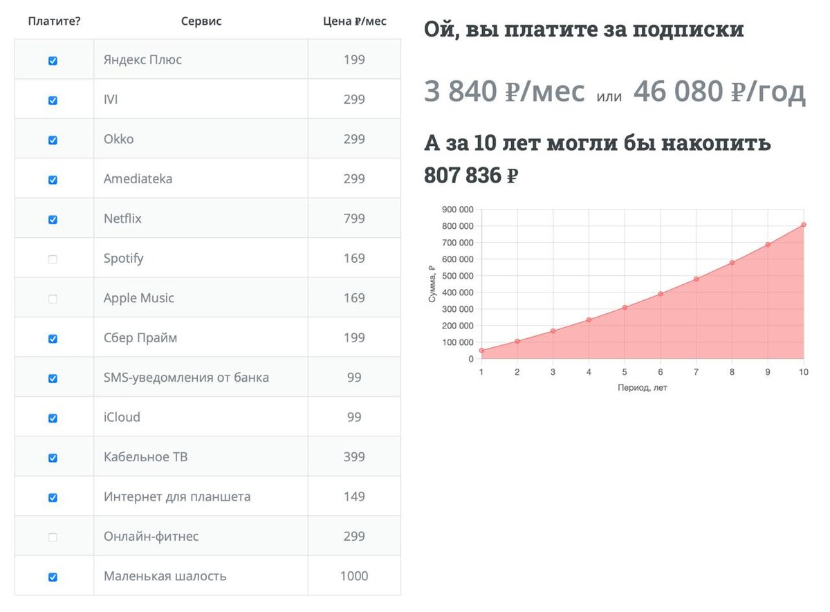 Кажется, что 300 рублей в месяц за очередную подписку – это просто мелочь, приятное дополнение к жизни, которое не бьёт по карману. Но если посчитать, сколько таких «мелочей» у нас в год, получается внушительная сумма, которую можно было бы использовать, скажем, для покупки облигаций. Да-да, вместо того чтобы беззаботно залипать в сериалах, можно было бы инвестировать эти деньги в что-то надёжное, со средней доходностью. Представьте себе: ежегодно вкладывая деньги в облигации (не супердоходные, но и не рисковые – то, что сердцу по карману), через 10 лет вы бы накопили приличный капитал. Вы только не подумайте, мы ни в коем случае не говорим, что нужно отказываться от любимого сериала или, боже упаси, кофе в кофейне. Вкусный кофе точно делает жизнь лучше и привносит слишком много восхитительных ощущений в утро миллиардов людей. Но чисто ради интереса мы сделали небольшой калькулятор, чтобы посчитать, сколько бы денег можно было бы заработать на инвестициях (положим, в те же облигации по