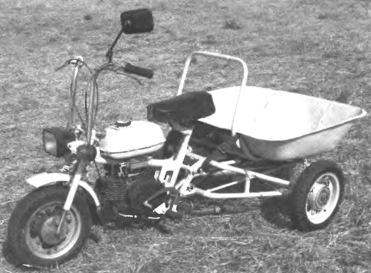 Правда, «на базе» — не совсем подходит — от него тоже мало что осталось: рама, руль с передней вилкой да одно колесо. Все остальное, вплоть до силового агрегата, пришлось подбирать и приспосабливать от другой подобной техники или делать самому.
