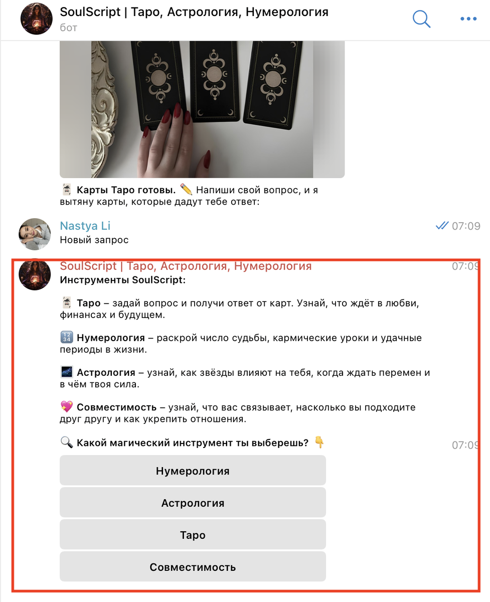 Когда в сотый раз слышишь от таролога: «Вижу в вашем будущем перемены… но какие — пока туманно», начинаешь подозревать, что и он сам ничего не видит. Мы устали от гадалок, которые за тысячу рублей нагуглили наш гороскоп, и от предсказаний в стиле «что-то хорошее, что-то плохое, но точно что-то случится». Так и родился SoulScript — наш бот-таролог — он не закатывает глаза в астрал, а делает нормальные расклады на Таро. Но, что самое интересное, он не остановился только на Таро! Мы решили, что раз уж предсказывать судьбу, то делать это по полной: астрология, нумерология, совместимость пар — всё в одном месте. Хотите узнать, куда исчезают деньги? Почему отношения идут по кругу? Или когда уже начнётся этот «удачный период»? Бот разберёт ситуацию со всех сторон и поможет вам с предсказанием онлайн. ✔ Отвечает на любые вопросы с помощью карт Таро, астрологии и нумерологии. ✔ Дает чёткие трактовки без «энергий Вселенной». ✔ Анализирует ситуацию, включая совместимость с партнёрами, удачные пер