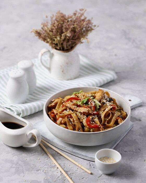 Удон — это японская пшеничная лапша, известная своей толстой текстурой и эластичностью. Это блюдо популярно благодаря своей универсальности и легкости в приготовлении. В сочетании с курицей и разнообразными овощами удон становится сытным и полезным вариантом обеда или ужина. В этой статье мы поделимся подробным рецептом приготовления удона с курицей и овощами, а также некоторыми хитростями для достижения идеального блюда. Для приготовления удона с курицей и овощами вам понадобятся следующие ингредиенты (на 4 порции): Перед тем как начинать готовить, необходимо подготовить все ингредиенты: Вскипятите воду в большой кастрюле. Добавьте лапшу удон и готовьте в соответствии с инструкциями на упаковке, обычно это занимает 5-10 минут. Важно, чтобы лапша была аль-денте — слегка жестковатой. После готовности откиньте лапшу на дуршлаг и ополосните холодной водой, чтобы остановить процесс варки. Это поможет предотвратить слипание лапши. Разложите удон с курицей и овощами по тарелкам. Посыпьте све