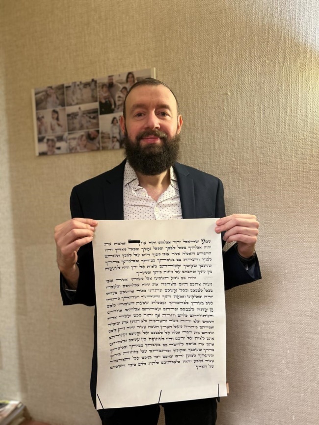 Нет, перед вами не Свиток Торы и не Мегилат Эстер. Это мезуза, просто удивительно крупных размеров. Ее написал сойфер еврейской общины Залман Макаров.