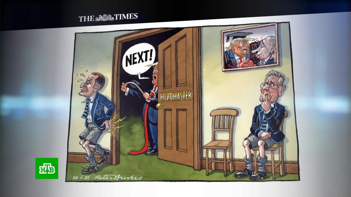 [ Смотреть видео на сайте НТВ ] Сегодня в Вашингтоне Дональд Трамп, как ожидается, примет своего французского коллегу Эммануэля Макрона. Тот заявил, что летит обсудить с президентом США роль Европы в вопросе урегулирования украинского конфликта. После Макрона в Вашингтон полетит британский премьер Стармер. Пресса уже предположила, как будут выглядеть переговоры Трампа и европейских лидеров. Карикатуристы The Times изобразили Макрона и Стармера нашкодившими школьниками, которые пришли к директору на порку. Об отношении президента США к лидерам Старого Света красноречиво говорит и другой факт. Сообщается, что президент Польши Дуда ожидал у двери Трампа полтора часа. Появилось видео, где он ходит в приемной из угла в угол и, судя по всему, очень переживает. Однако говорили лидеры всего 10 минут. СМИ сообщают, что всё это время Дуда призывал Трампа не выводить американские войска из Европы. [ Смотреть видео на сайте НТВ ]