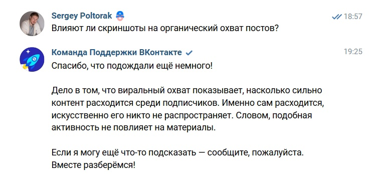 Недавно, на одной из конференций по SMM услышал мнение спикера, что скриншоты постов просто космически сильно влияют на органические охваты и алгоритм их учитывает. Честно, удивился, т.к. много работая с ВК, такой информации ни в официальных источниках, ни в кулуарах агентских не слышал.. Решил, что нужно официальную точку зрения и пруфов найти. Обратился к статье: https://vk.ru/@authors-algoritmy-lenty-vazhnye-kriterii-dlya-viralnyh-ohvatov и напрямую спросил у техподдержки ВК. Скрин переписки во вложении (ранее в переписке было уточнение, что скрин именно не в посте, а самого поста). В статье тоже ничего. Другими словами, нужно доверять профессионалам, если это подтверждено результатами, доказательной базой. И очень аккуратно относиться к псевдонаучности, чтобы не впасть в заблуждение и не наделать того, что на охваты не повлияет. Ну или еще их снизит. Сергей Полторак
