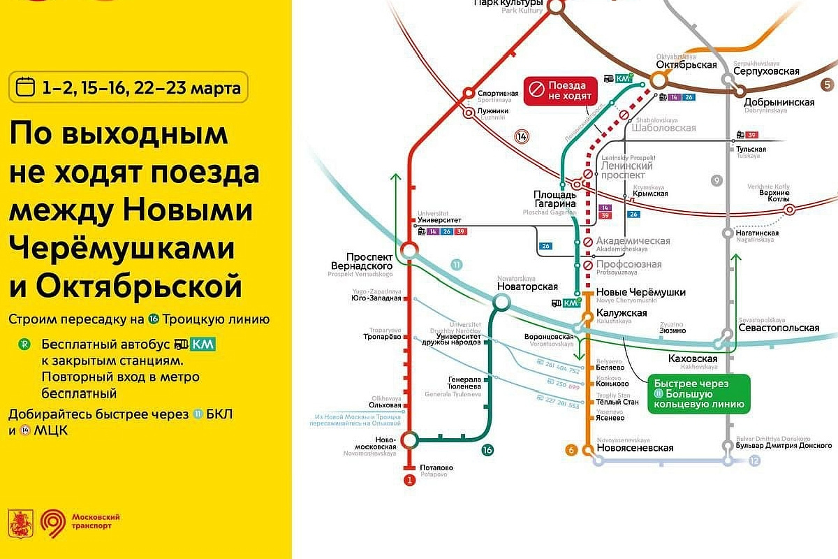 марте 2025 года участок Калужско-Рижской линии московского метро между станциями «Новые Черёмушки» и «Октябрьская» будет закрыт по выходным дням. Как