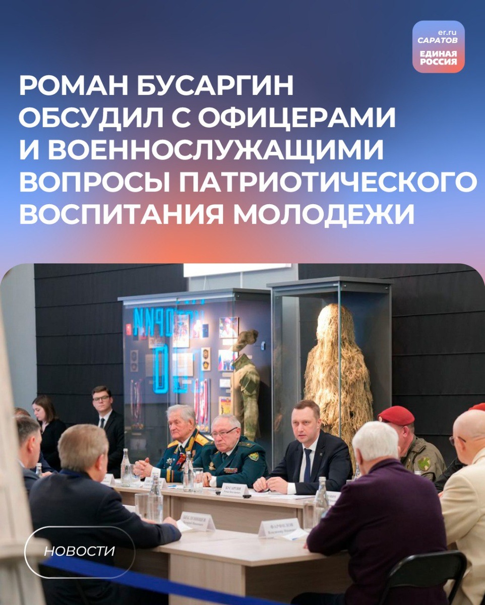 🎖️Губернатор, секретарь регионального отделения партии «Единая Россия» Роман Бусаргин встретился с офицерами и военнослужащими на площадке музея специальной военной операции. Обсуждались вопросы патриотического воспитания молодежи и сохранения памяти о подвигах участников СВО. 💬«Вместе с офицерами и нашими военнослужащими сегодня на площадке музея специальной военной операции обсуждали вопросы патриотического воспитания молодежи и сохранения памяти о подвигах участников СВО. Это важные темы, особенно в преддверии празднования 80-летия Победы в Великой Отечественной войне. Приуроченные к этой дате мероприятия уже начались в Саратовской области. Проговорили, что будем по максимуму вовлекать в них молодежь. Отдельно обсудили, как ещё можно увековечить память участников СВО. Работа в этом направлении в регионе ведется. У каждого есть понимание, что о подвигах наших ребят нужно рассказывать как можно больше. Это наш долг перед теми, кто отдал жизнь за Родину. Члены совета высших офиц