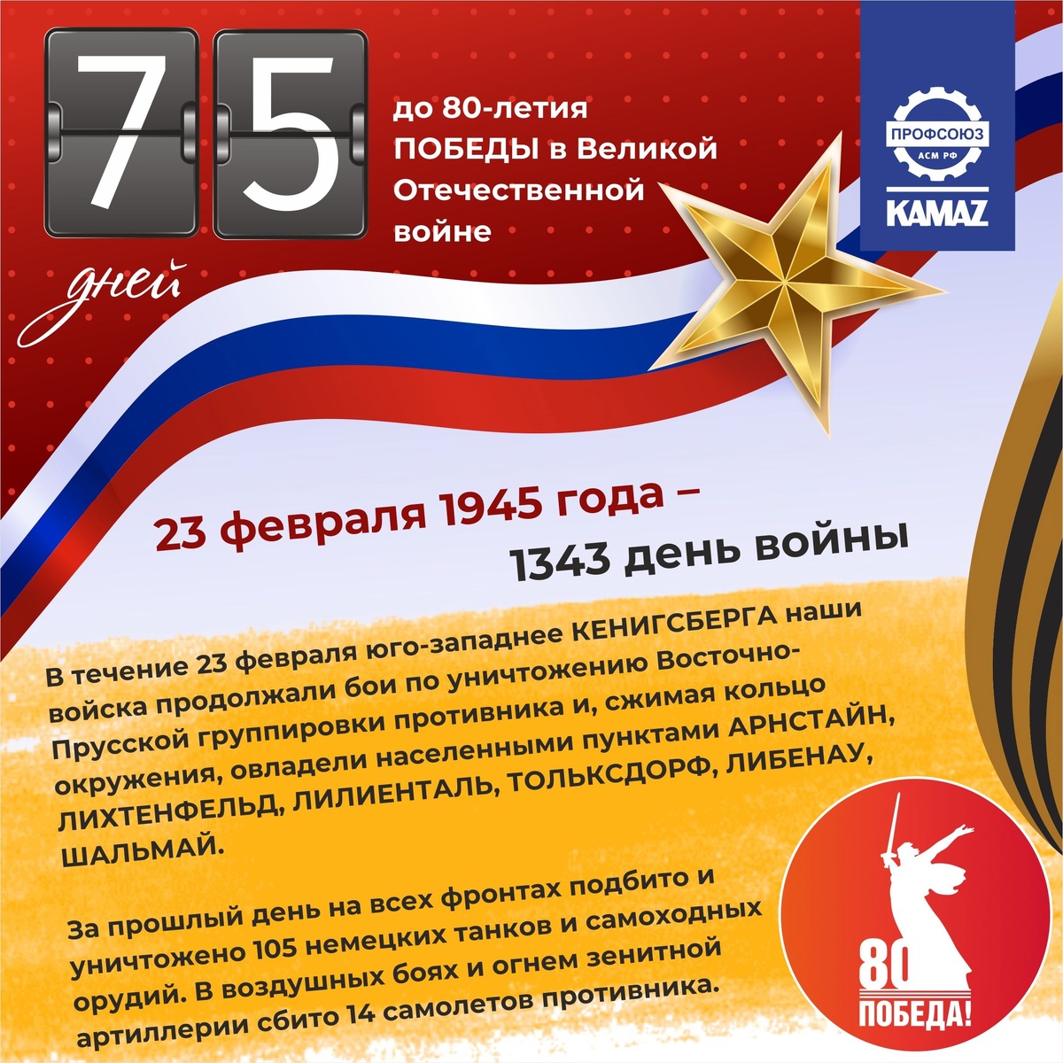 В течение 23 февраля юго-западнее КЕНИГСБЕРГА наши войска продолжали бои по уничтожению Восточно-Прусской группировки противника и, сжимая кольцо окружения, овладели населенными пунктами АРНСТАЙН, ЛИХТЕНФЕЛЬД, ЛИЛИЕНТАЛЬ, ТОЛЬКСДОРФ, ЛИБЕНАУ, ШАЛЬМАЙ. В боях за 22 февраля в этом районе наши войска взяли в плен около 500 немецких солдат и офицеров. В ПОМЕРАНИИ наши войска, сломив сопротивление противника, овладели городом и железнодорожным узлом АРНСВАЛЬДЕ. Войска 1-го БЕЛОРУССКОГО фронта после месячной осады и упорных боев завершили разгром окруженной группировки противника и 23 февраля полностью овладели городом и крепостью ПОЗНАНЬ — стратегически важным узлом обороны немцев на Берлинском направлении. В ходе боев в ПОЗНАНИ войска фронта взяли в плен 23.000 немецких солдат и офицеров во главе с комендантом крепости генерал-майором МАТТЕРН и его штабом, а также захватили следующие трофеи: самолетов—365, танков и самоходных орудий — 32, орудий — 584, минометов — 177, пулеметов — 4.490, в