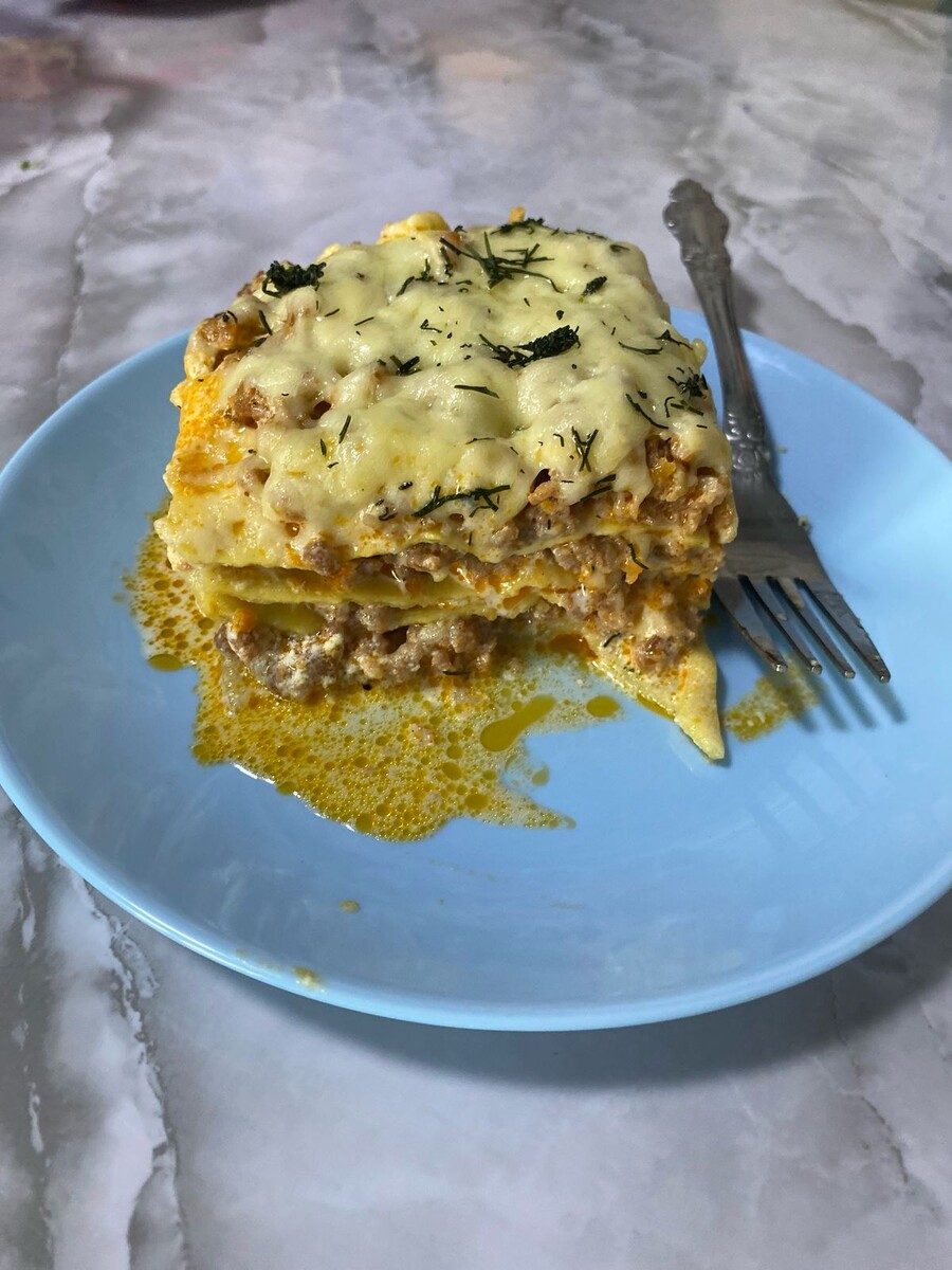 Для начинки : нарезать лук мелкими кубиками, морковь натереть на тёрке. Обжарить на сковороде 5-10 минут. Добавить фарш и продолжать готовить до полуготовности. Затем добавить томатный соус, чеснок, соль, перец и мелко нарезанную зелень. Тушить минут 5. Форму смазать маслом, Выложить поочерёдно, слой начинки (обжаренный фарш), слой листов лазаньи. Первым и последним должен быть фарш. Сливки посолить, поперчить, затем залить лазанью так чтобы жидкость была выше лазаньи. Форму накрыть фольгой и поставить в предварительно разогретую духовку до 190°С.на 40-50 минут. Достать из духовки, снять фольгу , посыпать тёртым сыром, рубленой зеленью и запекать ещё минут 10-15. до образования румяной корочки. Готовое блюдо вынуть из духовки, накрыть крышкой и оставить на 7-10 минут.