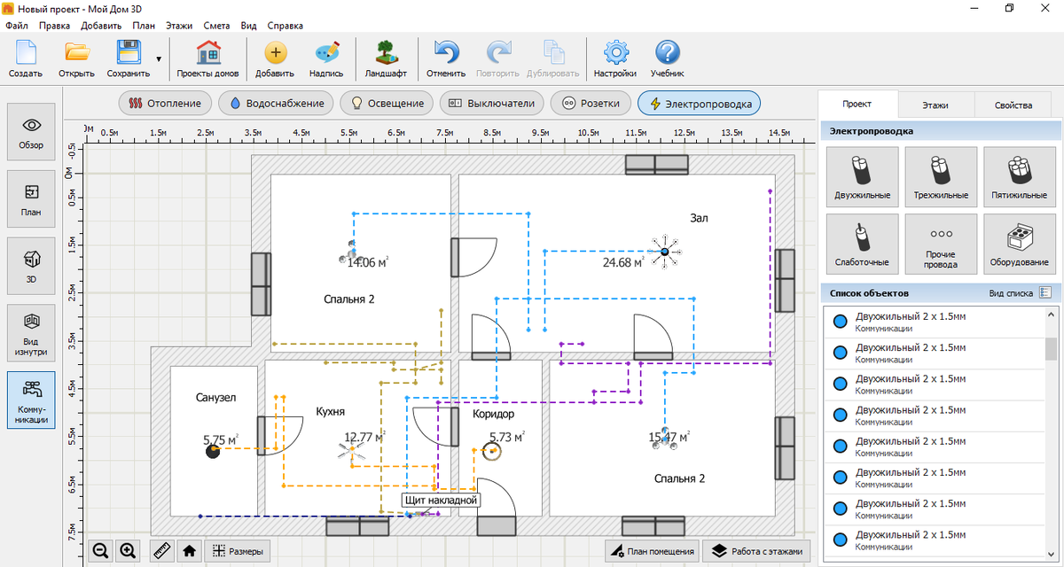 Перед началом нового строительства важно иметь точное представление о доме, который вы собираетесь возвести. Строители заранее предусматривают, какой фундамент наиболее устойчив, из какого материала будут стены и крыша, как удобнее провести воду и другие нюансы. В расчетах гораздо удобнее отталкиваться от готового проекта. Такой можно создать в Мой Дом 3D. Это десктопная программа, в которой можно создать полноценный макет здания. Выбрать материалы отделки, продумать планировку, меблировать и декорировать помещения, прогуляться по будущему дому в режиме «Вид изнутри». Недавно вышло обновление: теперь в Мой Дом 3D можно работать с коммуникациями. Оценим эффективность новой функции в статье! Готовый чертеж электропроводки учитывает толщину сечения, заземление, силу тока. Все провода обозначены разными цветами, к тому же вы можете оставлять текстовые пометки. Выбирать расположение люстр и ламп стало еще удобнее. При добавлении светильника на план в режиме «Освещение» отображаются расстоян