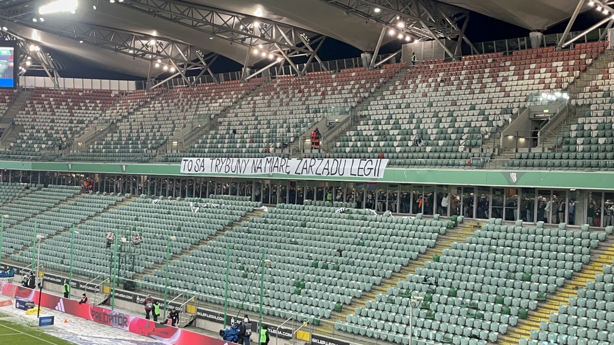 Прямо перед стартовым свистком болельщики «Легии» массово покинули трибуны. Баннер на пустом секторе гласил: «Трибуны, соответствующие уровню правления Легии».