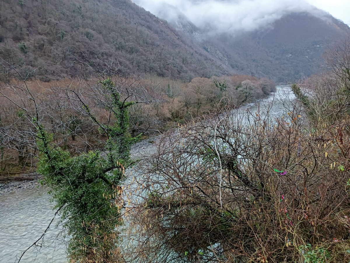 Зачем мне ехать на озеро Рица? Затем, что это самый раскрученный бренд Абхазии, и не важно, что на дворе февраль. Зимняя Рица – это совсем другая история. Февраль дарит озеру тишину и умиротворение. Заснеженные вершины гор отражаются в кристально чистой воде, создавая ощущение сказки. Исчезают шумные лотки с сувенирами, и можно спокойно насладиться величием природы. Это да, но не в моем случае. Рица в феврале – это побег от суеты, возможность почувствовать себя наедине с природой и увидеть Абхазию с другой, более тихой и лиричной стороны. Это как открыть для себя секретное место, спрятанное от посторонних глаз. Конечно, тихо и уединенно, без толп туристов! И, да - это здорово! А в "Ласточке" только десяток пассажиров. -А дальше? А дальше: быстро опустевший перрон, и я перед местным жителем, который обещает меня "прогулять" на Рицу за 5₽. Конечно едем, дорогой! В нижней части ущелья идет дождь. По пути есть ресторан с очень "хорошими" ценами. Дальше дорога проходит в ущелье