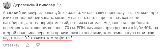 Вы не задумывались - почему все покупные напитки имеют свой вкус? Я вот задумался. А подумать в этом направлении мне подсказал один комментарий: По классике работы на бражной колонне человек успел хапнуть хвостов - температура скакнула на 0,2 градусов. Но по опыту - это ничего не значит, тут нужно смотреть сколько он перегонял спирта-сырца, очень может что его было мало, а потому было критично для хвостов. Однако я вижу тут немного другое: человек чувствует какой-то левый запах, который он идентифицирует как хвосты. А это с вероятностью 99,9% переходные фракции типа изоамилола. И как бы с ними не боролись, они все равно размазываются по всему погону и пролетают через дефлегматор в очень малых количествах. Но их хватает чтобы испортить продукт. Вот из-за таких фракций ректификационщики смотрят свысока на дистиляторщиков - у него продукт чище! Я тоже долго думал, что колонна не удачная, что хапнул хвостов - ну никак я не мог сделать идеальную самогонку с высокой степени очистки. Кстати,