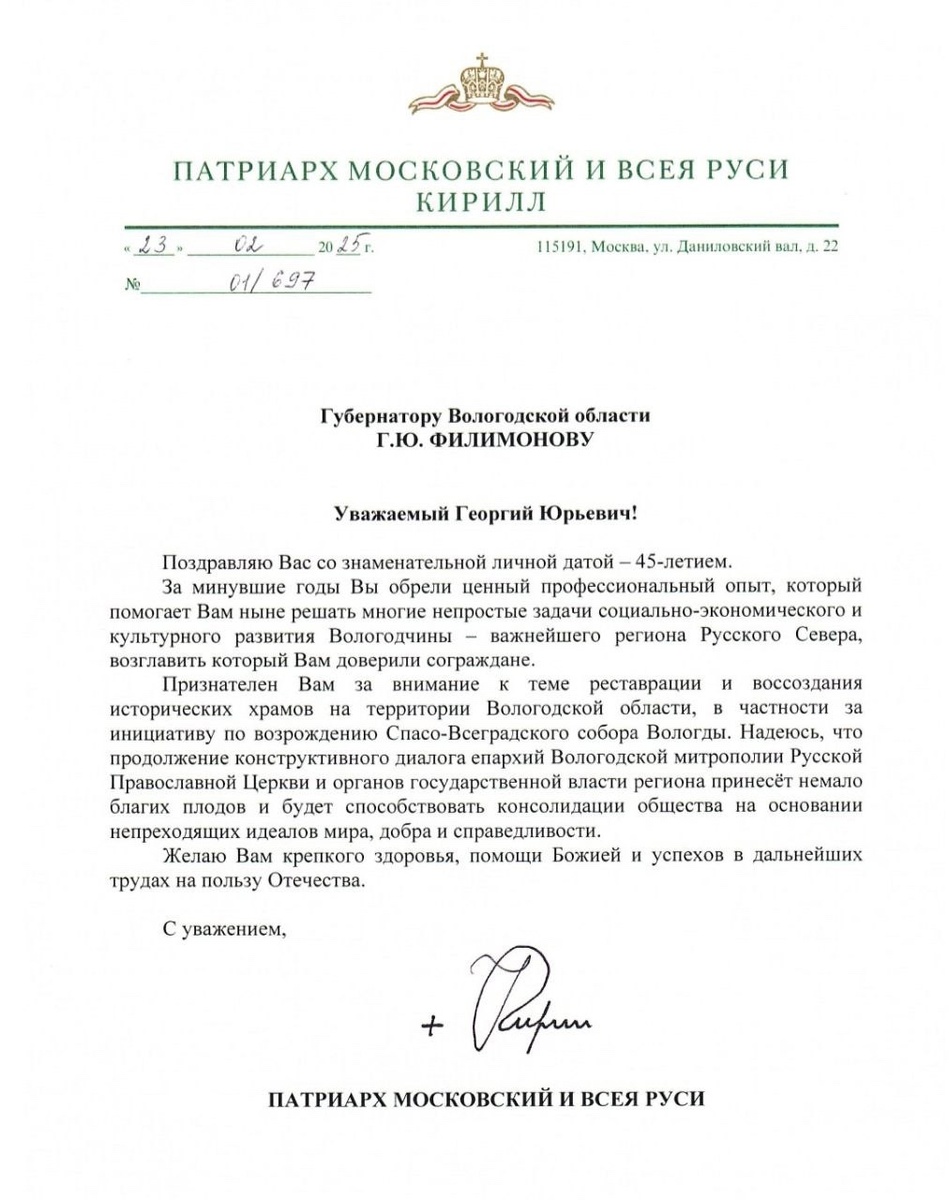 Об этом сообщила пресс-служба главы региона Георгия Филимонова. "Вы обрели ценный профессиональный опыт, который помогает решать многие непростые задачи социально-экономического и культурного развития Вологодчины - важнейшего региона Русского Севера, возглавить который вам доверили сограждане. Признателен за внимание к теме реставрации и воссоздания исторических храмов на территории Вологодской области, в частности, за инициативу по возрождению Спасо-Всеградского собора Вологды. Надеюсь, что продолжение конструктивного диалога епархий Вологодской митрополии Русской православной церкви и органов государственной власти региона принесет немало благих плодов и будет способствовать консолидации общества на основании непреходящих идеалов мира, добра и справедливости. Желаю крепкого здоровья и успехов в дальнейших трудах на пользу Отечества", - говорится в поздравлении. "Выражаю сердечную благодарность Святейшему Патриарху Московскому и Всея Руси Кириллу за направленное поздравление", - ответ
