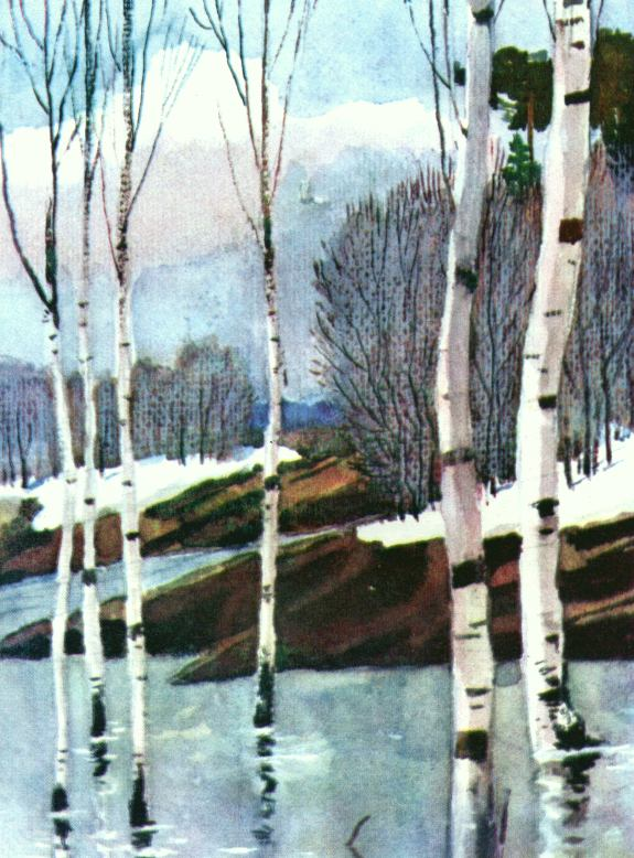 Эта иллюстрация с прекрасной очевидностью показывает нам приход весны: земля сбрасывает снежный покров, ручьи переполнились талой водой, заливают ложбинки. А молодые берёзки, словно стесняясь своей наготы, сбились в кучку и жаждут прикосновения тёплых солнечных лучей. Они уже очнулись от зимней спячки.