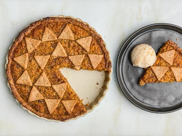 Чтобы получилось хорошее песочное тесто, не месите его слишком долго; как только оно соберется в тесто, оно будет готово отдохнуть и охладиться. И не волнуйтесь, если оно слоистое, когда вы его раскатываете — это хороший знак и означает, что тесто будет иметь приятную, рассыпчатую текстуру после приготовления. Просто заделайте все отверстия в форме для пирога обрезками.