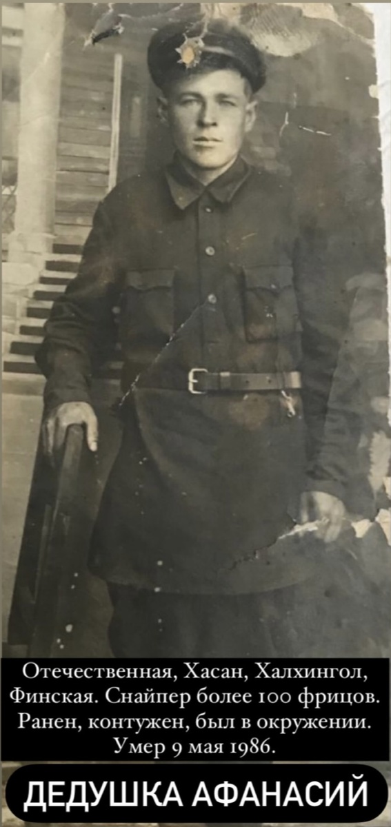 Дед Афанасий служил в армии, воевал на Финской войне, прошёл всю Отечественную, был участником Японской войны: защищал границы своей Родины на озере Хасан и реке Халхин-Гол. Ещё он говорил, что были машины «ГАЗ два раз» и что он встречался с лётчиком со смешной фамилией Коккинаки.
