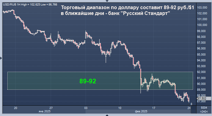 Рубль упадет относительно текущего уровня Курс доллара к рублю расчётный, фьючерс, вечный фьючерс и межбанк. Курс евро к рублю расчётный, фьючерс, вечный фьючерс и межбанк. Курс юаня к рублю биржевой, фьючерс, вечный фьючерс и межбанк. Торговый диапазон по доллару, скорее всего, составит в ближайшие дни 89-92 руб./$1, по евро - 92-95 руб./EUR1, полагает директор департамента операций на финансовых рынках банка "Русский Стандарт" Максим Тимошенко. "В последние торговые сессии рубль продолжил свое укрепление, на его стороне по-прежнему выступает жесткая ДКП российского регулятора, - отмечает эксперт в комментарии. - А также - приближение пика налоговых выплат в конце месяца и избыточного предложения иностранной валюты. Тем временем одним из основных факторов, влияющих на курс рубля в ближайшие дни, остается геополитика, где в фокусе внимания прогнозы на мирные переговоры. В качестве позитивного для рубля фона - сообщения о том, что он стал мой перспективной валютой на развивающихся рынка