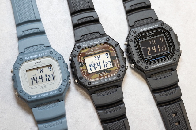 Casio, наш любимый бренд, который всегда радует качеством и ценой, выпустил новую модель часов W-218H. Часы выполнены в классическом квадратном корпусе, который уже стал визитной карточкой Casio. Представлены они в трех цветах: черный, черный с камуфляжем и синий. Черный вариант, кстати, оснащен бело-черным жидкокристаллическим дисплеем, что придает ему особый шарм. Теперь о функционале. Часы оснащены 5-атмосферной водозащитой, что позволяет не только не бояться дождя, но и спокойно плавать в бассейне или даже нырять на небольшую глубину. LED-подсветка позволяет легко видеть время даже в темноте. Есть все необходимые функции: секундомер, ежедневный будильник, автокалендарь и возможность выбора между 12- и 24-часовым форматом времени. Батарейки хватит аж на 7 лет, так что можно не переживать о частой замене. W-218H-1BJF Размеры корпуса 44.4×43.2×10.8 мм, а вес всего 37 грамм. Легкие и удобные, они идеально сядут на любое запястье. Ремешок из резины, что делает их еще более практичными