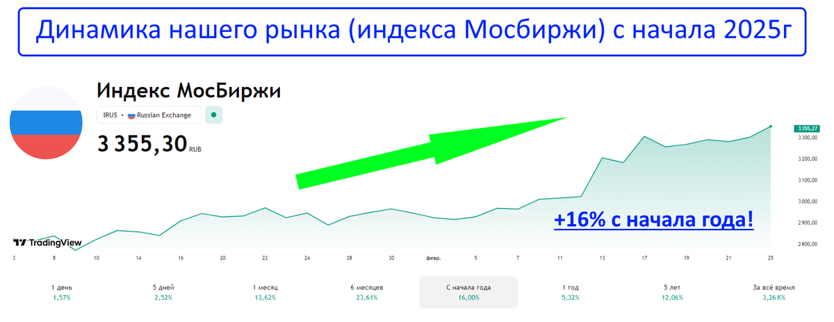 Пока одни инвесторы считают, что покупать еще слишком рано, а другие, что уже слишком поздно, я продолжаю строго придерживаться своей стратегии и инвестировать! Сегодня, 25 февраля, я получил зарплату, часть её вложил в рынок и в этой статье покажу свой портфель, как он изменился после покупок, а так же расскажу, какие акции я купил. С начала 2025г года наш рынок вырос на 16% на фоне улучшения отношений РФ с США. Очевидно, что сейчас это главный драйвер, который толкает рынок вверх.