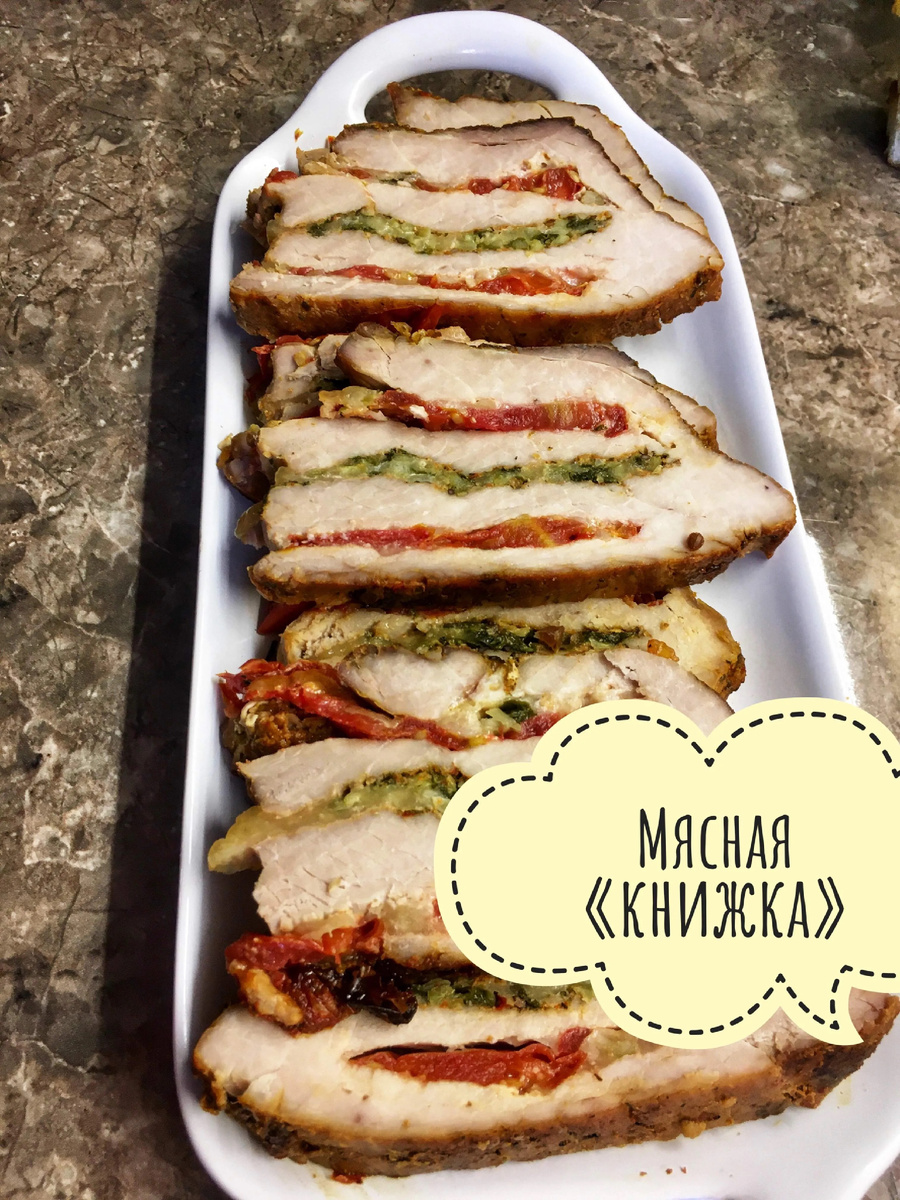 🥩+🧀+🍅=Мясная «книжка» из свинины с сыром, зеленью и помидорами. ✅ВКУСНО ✅КРАСИВО ✅ПРОСТО 👩🏻🍳 ИНГРЕДИЕНТЫ: Мясо свинины (окорок у меня) – 1 кг Сыр – 100 г Помидоры – 2 шт. Зелень любая (у меня черемша) Оливковое масло – 1,5 ст.л Специи для мяса – 3 ч.л Чеснок Соль, перец – по вкусу 👩🏻🍳Приготовление: 1. Чеснок очищаем и натираем на мелкой терке. Далее смешиваем: горчицу, чеснок, перец, оливковое масло и специи для мяса. 2. Свинину промываем под прохладной водой и хорошо обсушиваем бумажными полотенцами. Делаем глубокие продольные надрезы, на расстоянии 1-1,5 см друг от друга, не прорезая мякоть до конца. Получилось 3 больших «кармашка». 3. Хорошо натираем мясо снаружи и внутри надрезов нашей ароматной смесью. Далее замотать пищевой плёнкой и убрать в холодильник для маринования на сутки. 4. И остаётся потом только заполнить «кармашки» начинкой. 1 кармашек-развернуть, посыпать немного сыром Далее выложить нарезанные помидоры; 2 кармашек-развернуть аккуратно, посыпать сыром и зе