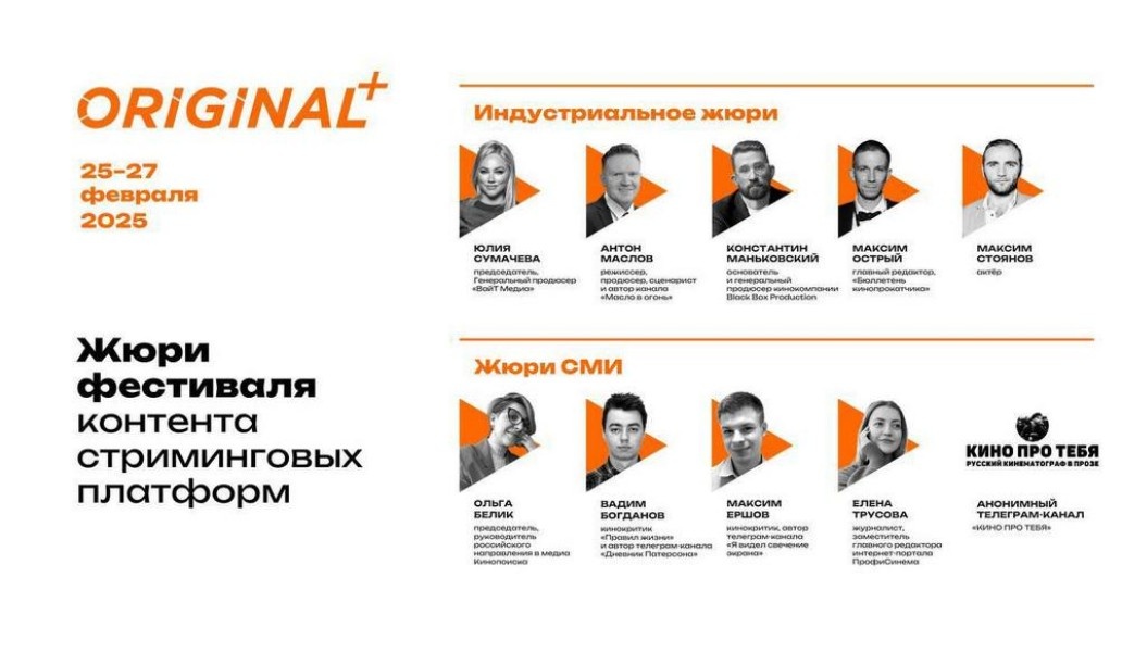 IV фестиваль контента стриминговых платформ Original+ пройдет с 25 по 27 февраля в Москве в рамках форума CSTB. Фестиваль Original+ стал ежегодной площадкой для демонстрации достижений российских стриминговых платформ, где каждый проект воплощает в себе высокое мастерство и креативность авторов. Неофициально фестиваль считается первым в году сериальным фестивалем, где впервые показывают новинки онлайн-кинотеатры, платформы и телеканалы. В программе фестиваля Original+ ожидаются показы фильмов, сериалов и шоу, которые впервые предстанут перед зрителями. Их увидят журналисты, критики, представители кино- и телеиндустрии, специалисты телекома и других областей. Программу Original+ в категориях «Сериалы» и «Шоу» по традиции будут оценивать два профессиональных жюри. В первое входят эксперты из сферы кинематографа, во вторую — представители СМИ и блогеры. Председателем индустриального жюри в этом году стала Юлия Сумачева, генеральный продюсер «ВайТ Медиа». В команде жюри также Антон Маслов,